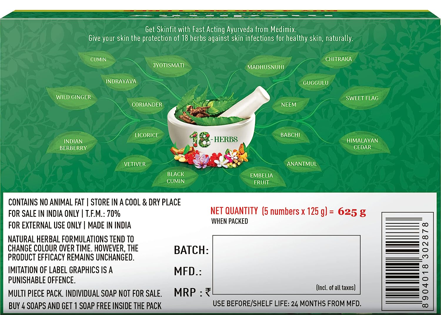 Medimix Ayurvedic Soap Contains an exclusive blend of the purest and premium grade vegetable glycerine and the time tested Ayurvedic formulation of Lakshadi oil. Successfully moisturizes dry skin making it soft and supple, and helps decrease itches and cracks caused by dryness.