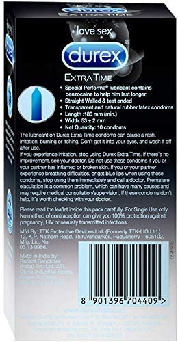 Enhance the intimacy of your special moments with the Durex Extra Time condoms. These condoms contain a special climax-control lubricant, benzocaine, that helps him last longer while providing the same level of reassurance and protection as a regular condom. The condoms also smell better which helps avoid unpleasant distractions and you can relax and enjoy to the fullest. Each Durex condom is dermatologically tested to ensure strength and high protection. No method of contraception can give you 100% protection against pregnancy, HIV, or sexually transmitted infections. Please read the instructions, especially when using condoms for anal or oral sex. Try different Durex condoms or indulge in Durex’s Play range of lubricants and rings to make love-making comfortable and exciting!