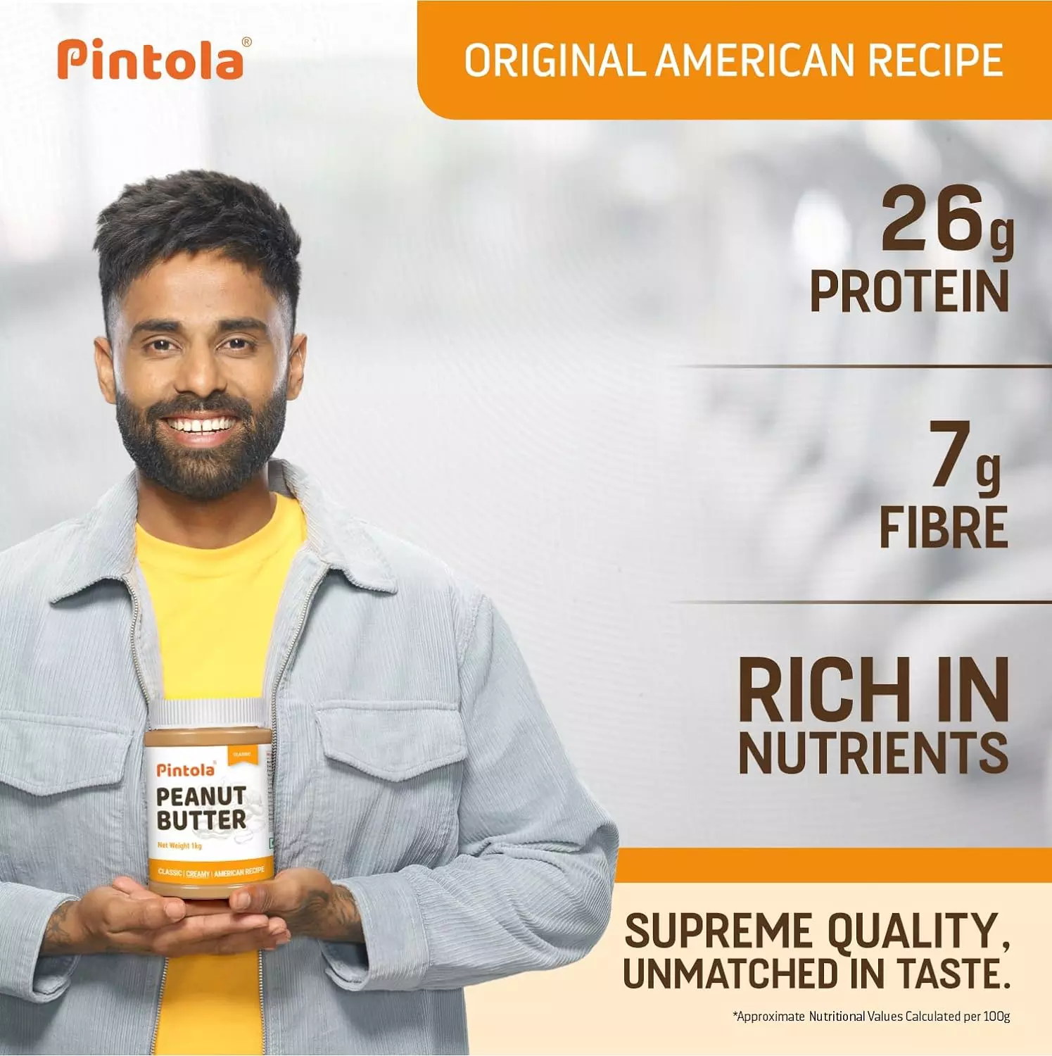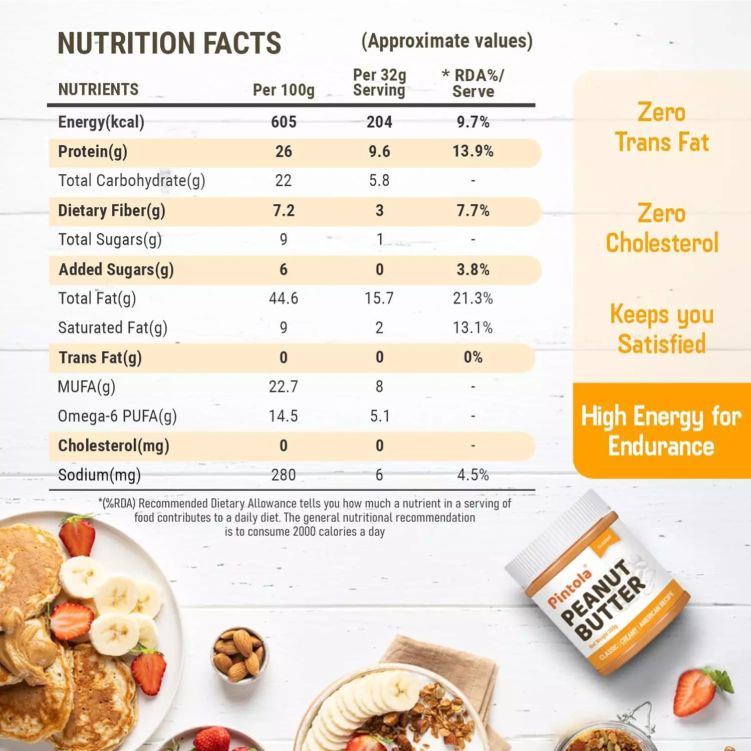 POWERFUL PROTEIN & FIBER BOOST: Energize your active lifestyle with Pintola Classic Peanut Butter 1kg! With a hefty 26g of protein and 7.2g of fiber per serving, this delicious spread keeps you fueled, supports muscle growth, and promotes healthy digestion. Take your fitness journey to new heights! SUPERIOR TASTE, PREMIUM QUALITY: Indulge in the irresistible taste of our carefully selected premium roasted nuts. Each jar of crunchy peanut butter delivers a rich, nutty flavor that satisfies your cravings. With a focus on superior quality, we ensure that every spoonful is a delightful experience, giving you the best peanut butter on the market. FITS YOUR HEALTHY LIFESTYLE: Whether you're following a gluten-free or dairy-free diet, Pintola Classic Peanut Butter Creamy has got you covered. Free from gluten and dairy, this peanut butter is a guilt-free choice that aligns with your health-conscious lifestyle. Enjoy the pure goodness without any compromises. NUTRITION-PACKED & VITALITY-DRIVEN: Our peanut butter is a nutritional powerhouse. Loaded with healthy unsaturated fats, including MUFA, and fortified with vitamin E and B3, it supports your overall well-being, endurance, and energy levels. Embrace a nutritious choice that tastes amazing and empowers your active life. VERSATILE DELIGHT FOR YOUR CULINARY CREATIONS: Unleash your creativity in the kitchen with Pintola Classic Peanut Butter Creamy. Elevate your favourite recipes, from wholesome smoothies to mouthwatering desserts, with rich and creamy textures. Or enjoy it as a quick, satisfying snack. The possibilities are endless with this versatile, delicious spread. WHAT MAKES PINTOLA A POPULAR CHOICE FOR NUT BUTTER LOVERS? - For MORE THAN A DECADE we have been crafting peanut butter with the finest ingredients! Our relationships with the community of farmers and growers are long-standing and deeply trusted. Imported machinery, our in-house laboratory and continuous roasting technology ensure that every jar we produce is identical in taste and quality.