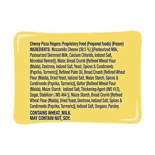 Crunchy, Cheesy Pizza, in a finger form-Mozzarella Cheese with Italian-style herbs Restaurant-like Cheese Pizza Ready in 3 minutes Satisfaction of serving a snack loved by all family members Cheese Pizza in Finger Form – a new cheesy snack in pizza flavour loved by all, restaurant-like taste in 3 mins the ‘preferred choice of prepared savoury snack for the family’ Rich and different eat experience associated with mouthful-ness/burst of cheese More filling/satiating in light moments of hunger à Creating stomach enriching experience “The cheese easily oozes out of the outer covering while frying”.