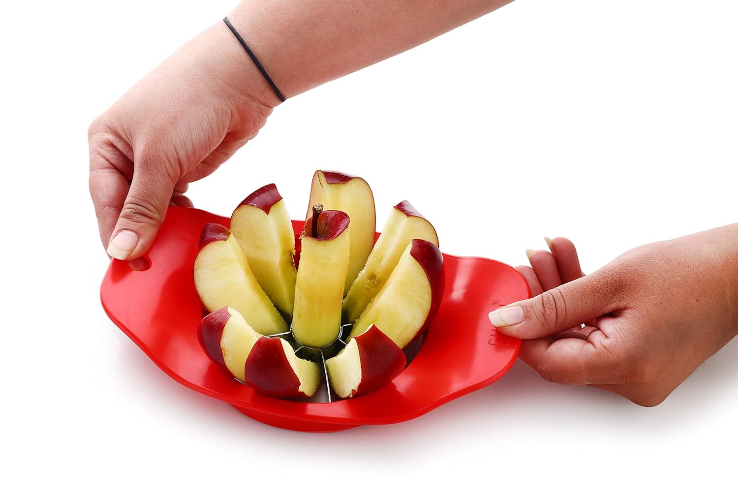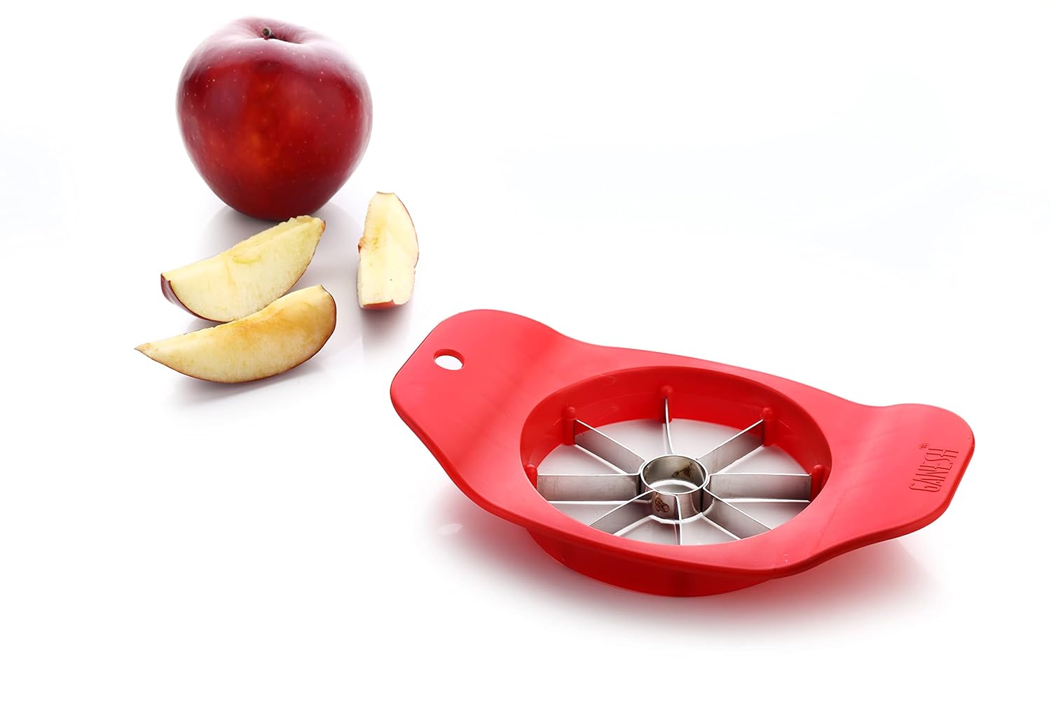 Cut Apples with Ease: The seeded core in the centre of an apple makes cutting it a particularly difficult and cumbersome experience. The Ganesh apple cutter, with its unique design and high quality materials, aids in cutting uniform slices of apples in a simple and efficient manner. Simply press it down against an apple and the sharp stainless steel blade slices through it into eight even slices. Multipurpose Use, Easy to Maintain: Using the Ganesh apple cutter, you can quickly serve your guests or family members with neatly cut apple slices or use them in a fruit salad as per your requirements. The unique design of this cutter precisely removes the core, thus eliminating seeds and giving you only the desirable flesh of the fruit. Made from high quality plastic and stainless steel, this apple cutter is durable and will last for a long time even with regular use. For cleaning, simply wash the cutter with detergent and water.