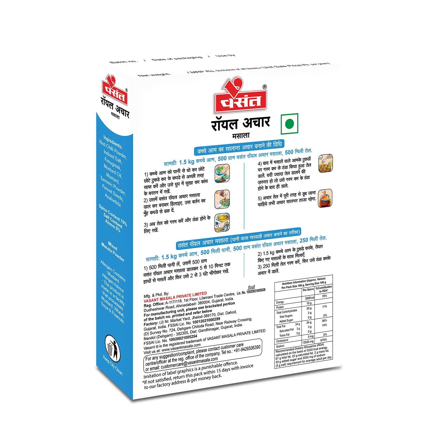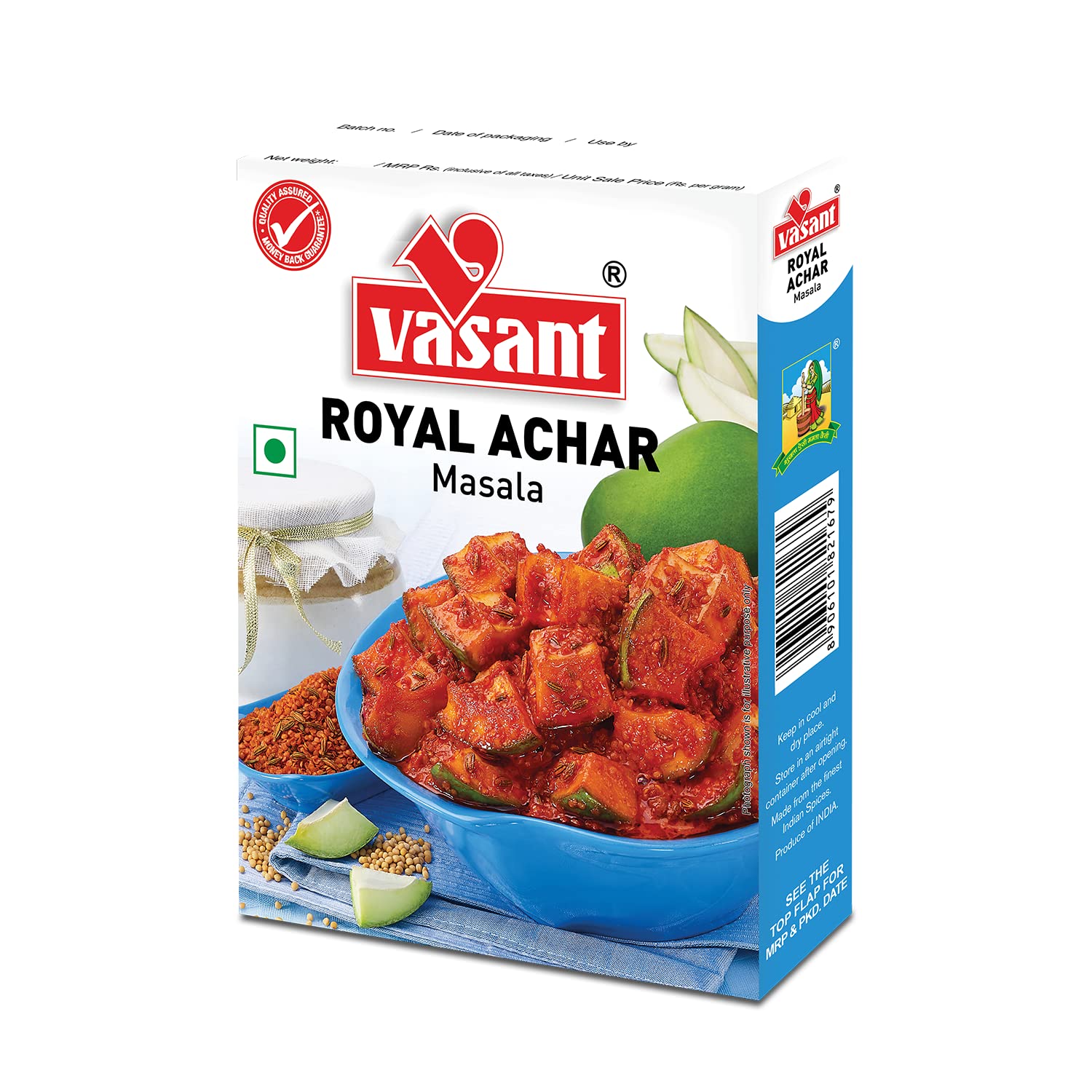 Vasant Achar Masala is extremely popular in the market. This classic blend of spices uplifts the taste of every food. Made out of various spices, it simplifies pickle making at home. Moreover, it is also known as a tastemaker and goes really well with Khakhra, daal, khichdi, etc. Ingredients Red Chilli Powder, Iodized Salt, Fenugreek, Mustard Oil, Mustard, Turmeric Powder and Asafoetida