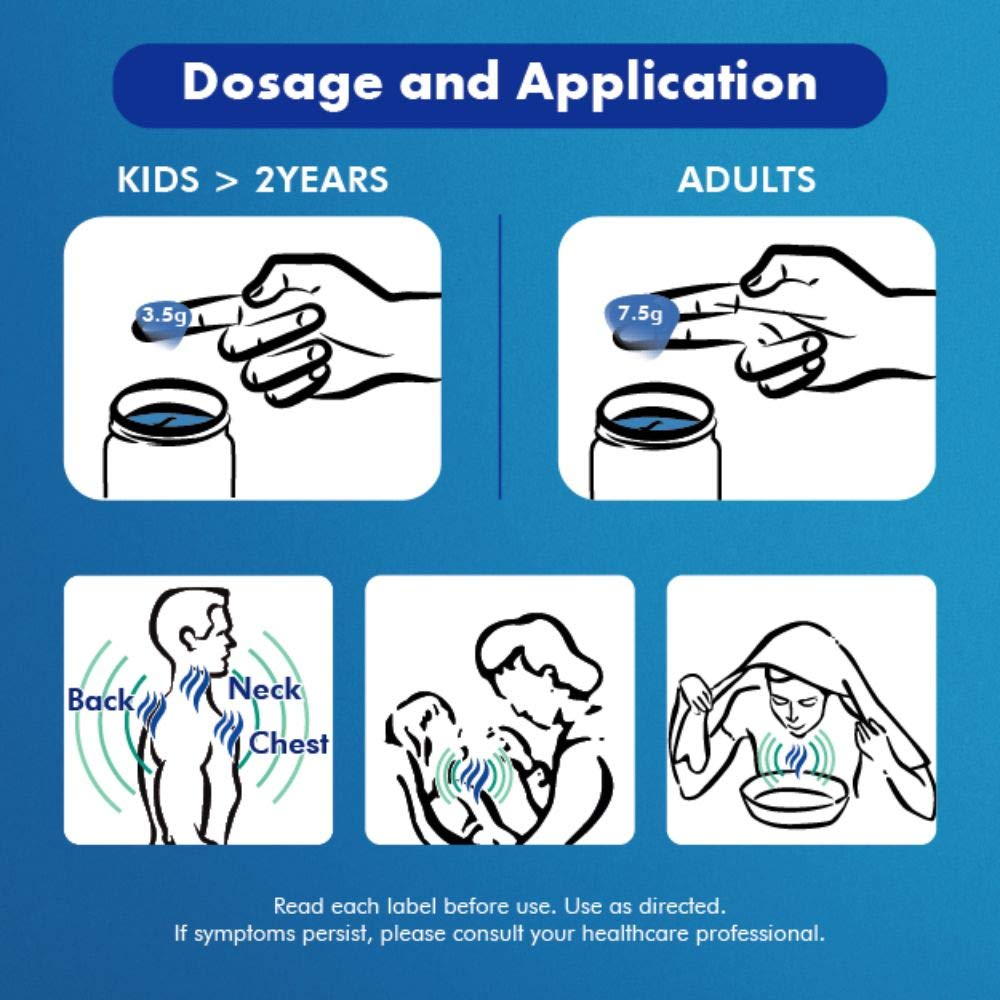 Vicks VapoRub contains menthol, camphor and eucalyptus oil, known for their therapeutic benefits in cough and cold relief. It provides effective multi-symptom relief from 6 symptoms- blocked nose, breathing difficulty, cough, body ache, headache & muscular stiffness.