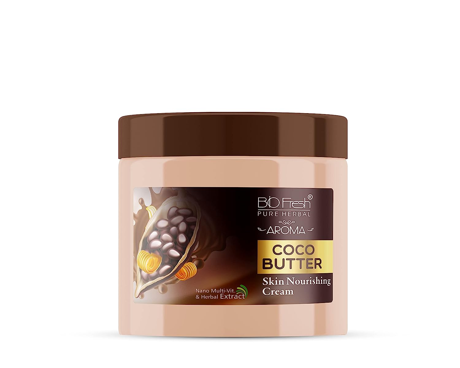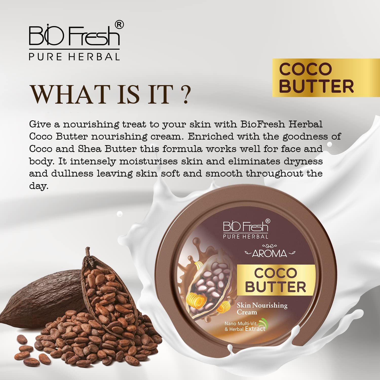 It's time to fall in love with your skin all over again with BioFresh Cocoa Butter Cream. Loaded with the goodness of Coffee, Cocoa, Sunflower Seed Oil, and Shea Butter, this body butter is all you need for keeping dryness away and moisture intact. Thanks to its high content of fatty acids and antioxidants, our Coco Body Butter combats free radicals, which cause dullness, darkening, and wrinkles. The rejuvenating fragrance of coffee & chocolate helps de-stress & lets you have a pleasant beginning of the day.
