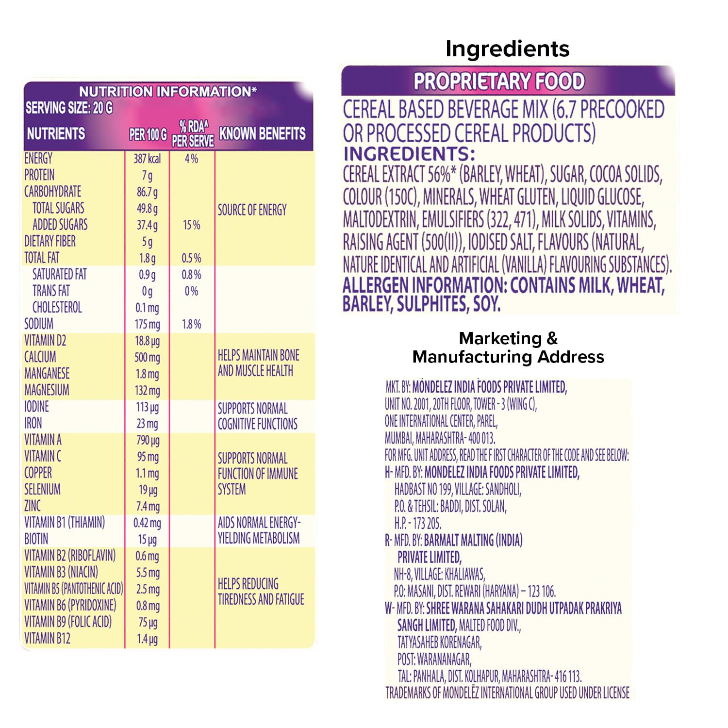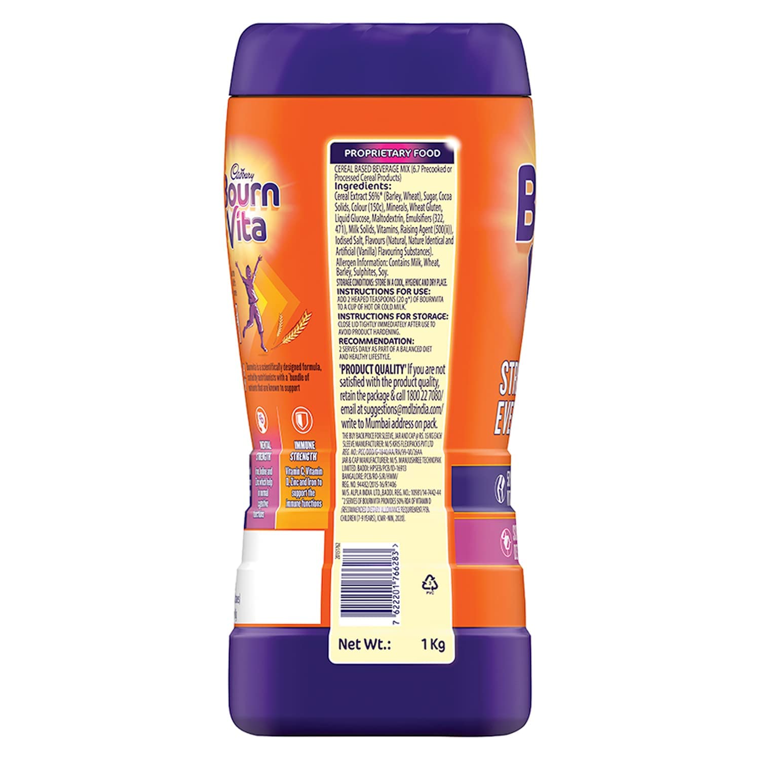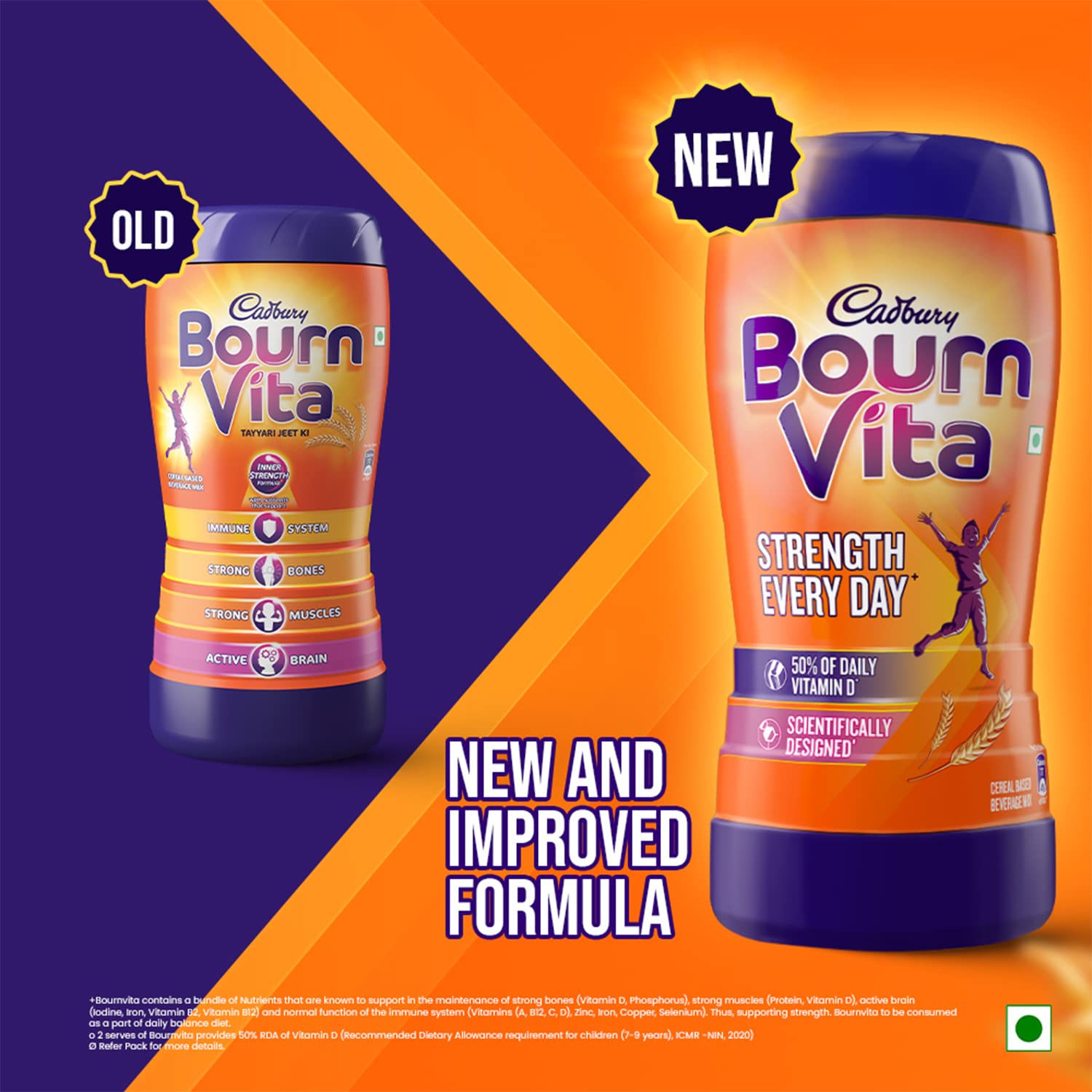 Cadbury Bournvita Chocolate Health Drink is a scientifically designed formula, crafted by nutritionists with a bundle of nutrients that are known to support Physical strength (Calcium, Vitamin D and Magnesium are known to maintain Bone and Muscle health); Mental Strength (Iron, Iodine and Zinc which help in normal cognitive functions); Immune strength (Vitamin C, Vitamin D, Zinc and Iron to support the immune functions). Thus, supporting strength. 2 serves of Bournvita provides 50% RDA of Vitamin D (Recommended Dietary Allowance requirement for children (7-9 years), ICMR -NIN, 2020). Bournvita to be consumed as a part of daily balance diet and healthy lifestyle.