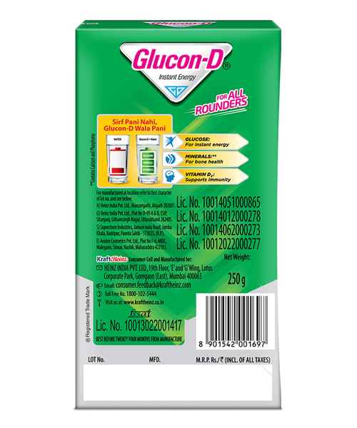 Summers can be daunting and especially when there's an enormous scorching sun always ready to drain out your energy and stop you from being the best of you. But thank god there is Glucon-D! Glucon-D contains glucose that helps replenish body glucose and fills you with the energy required to stay active. It is easily absorbed by the body, thus giving out an instant energy boost and refreshment. Enriched with Vitamin-C and Minerals, including Calcium and Phosphorus, this glucose drink helps charge you up to fight tiredness and promotes mental alertness. Add Glucon-D to a glass of water every day to provide growing active children the energy that keeps them going and adults, refreshment after a long day.