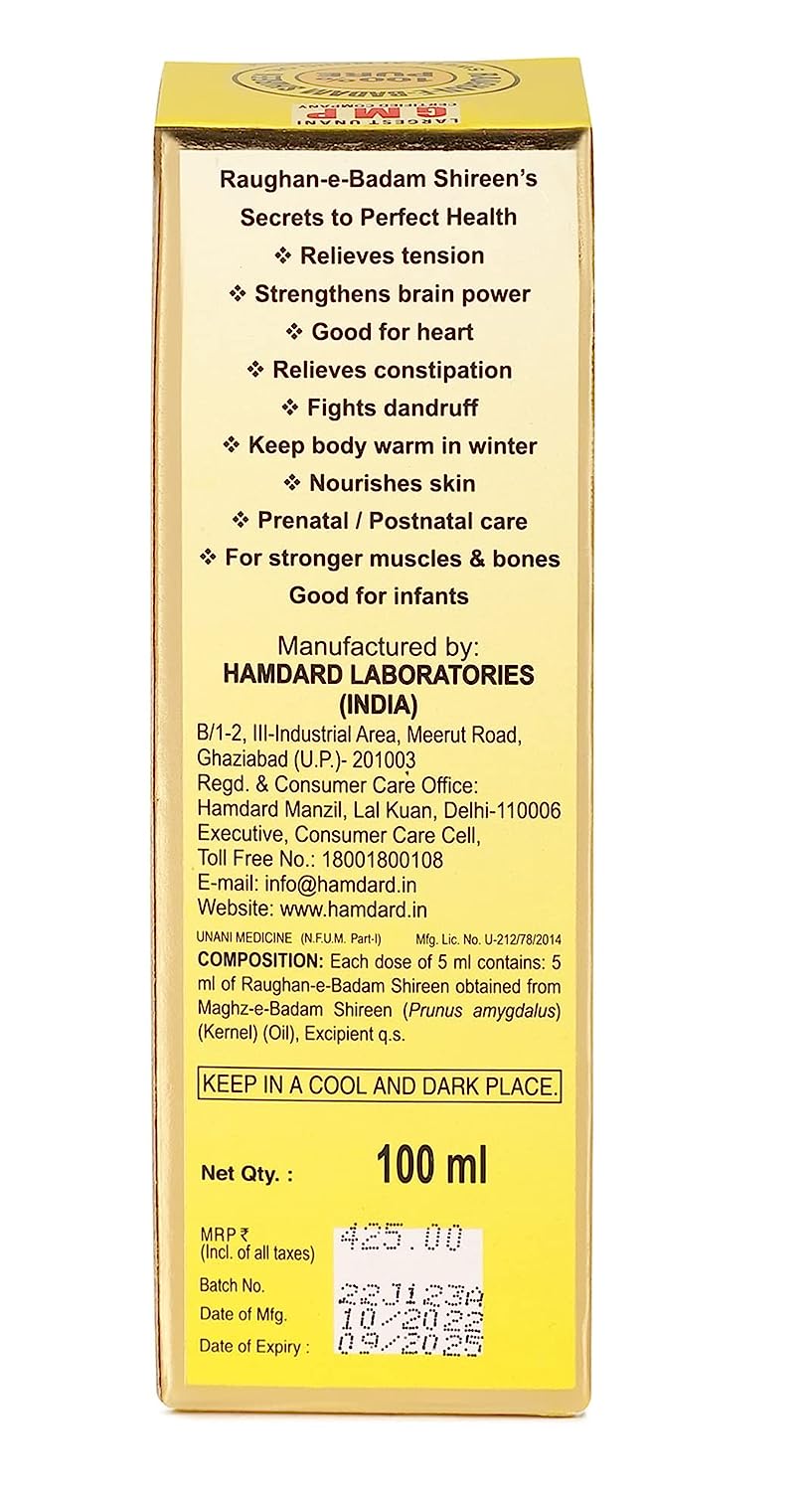 Almond oil had been used extensively for its health benefits and as a beauty aid much before science caught up with its goodness. Its purity is something you can trust with your eyes closed. The sweet almond oil has all your health and beauty secrets packed in a bottle and comes exclusively from edible almonds is selectively cultivated for their sweet taste. It is the oil popularly used for skin and hair care. It has many culinary uses too. Rogan badam shirin a sweet almond oil it's perfect health, Goof For heart, Fight Dandruff, Nourishes Skin, prenatal / postnatal care.