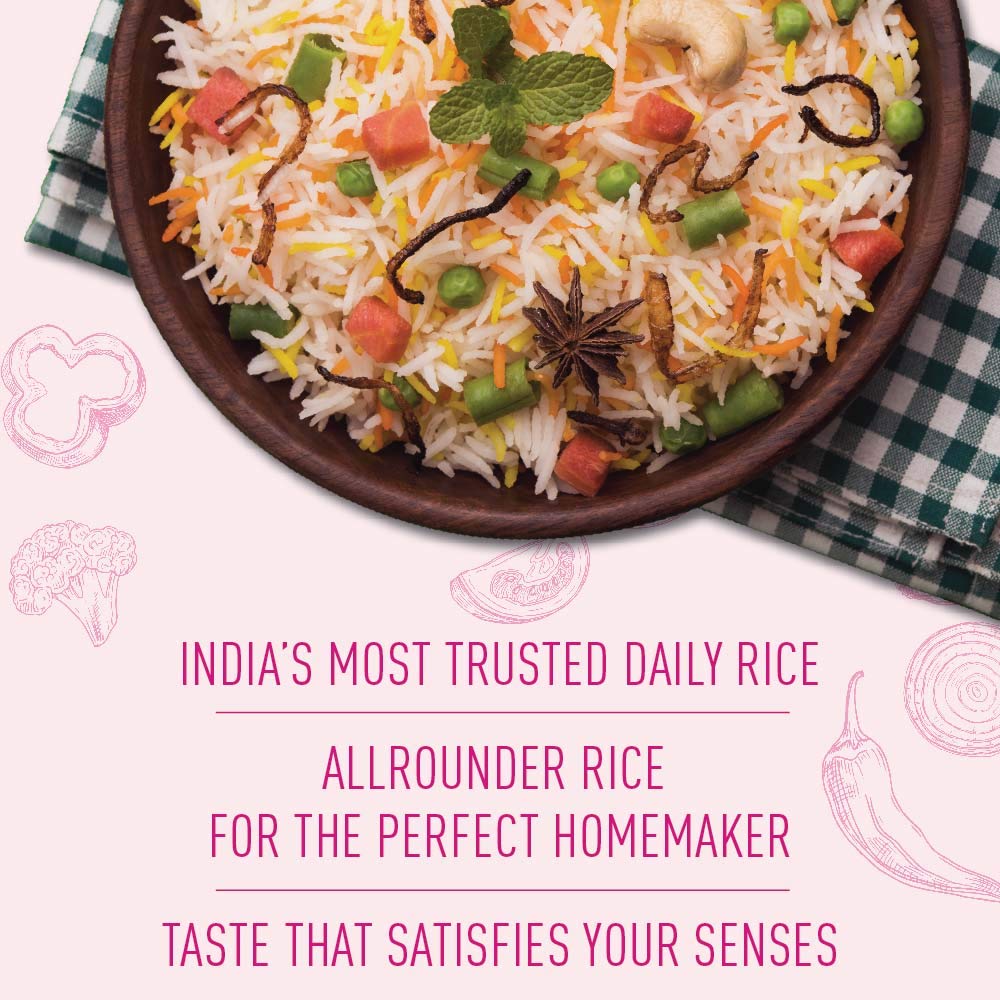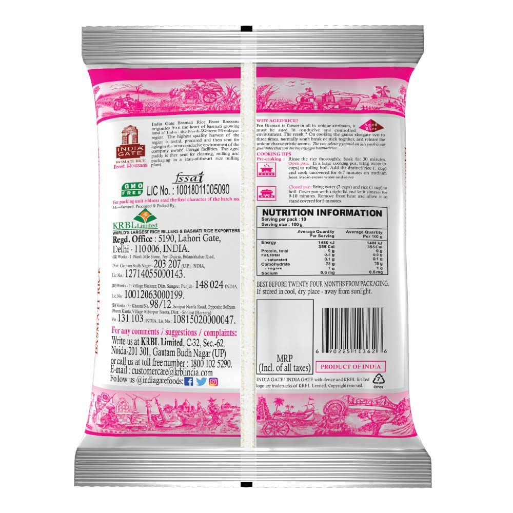 From the World's No. 1 Basmati Rice* brand, India Gate Feast Rozzana Rice is everyday rice that makes each meal memorable. This daily use basmati rice leaves you feeling satisfied and nourished. Grown in the north-western foothills of the Himalayas, this Basmati rice helps fuel your body with the essential vitamins and nutrients. It is aged for a minimum of 1.5 years which results in better volume, fluffiness, yield and distinct basmati aroma & taste. The India Gate Feast Rozzana basmati rice is produced with international quality standards, cleaned, sorted and packed in superior, hygienic and state-of-the-art facilities, completely untouched by human hands.