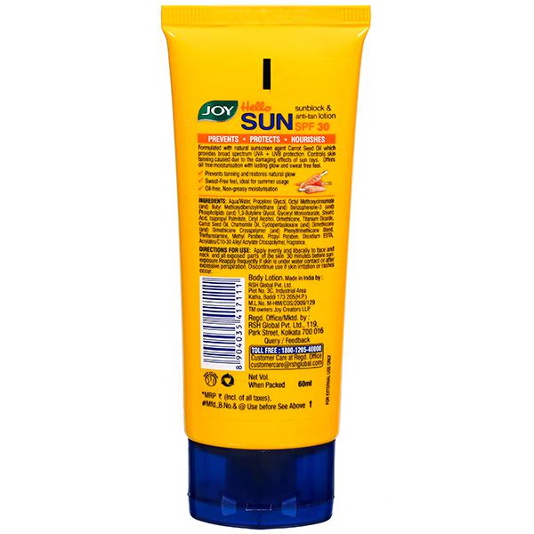 Shield your skin from sun damage with the new Joy Hello Sun Sunblock & Anti-tan Lotion SPF 20. Infused with Raspberry Fruit Oil, this sunscreen lotion blocks the harmful UVA and UVB rays of the sun that causes sunburns, tanning and pigmentation. It also offers instant non-greasy moisturisation that imparts a healthy glow to your skin.